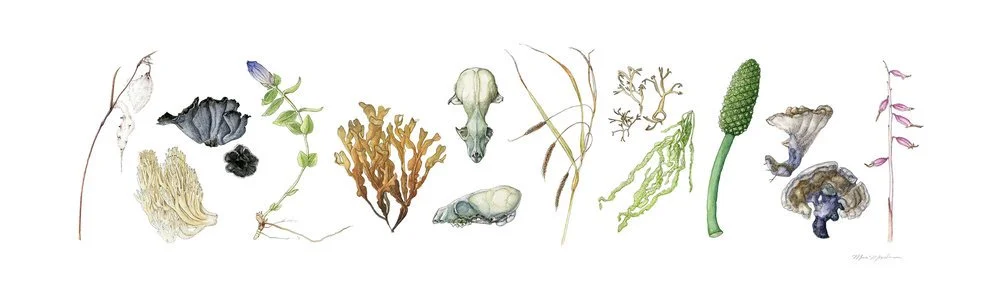 The objects are categorized by color—showing the human and more-than-human all together on the same page and challenging traditional western taxonomy. The paintings grew out of the joy and heartbreak of two summers spent alongside Elsa and Natalie, bushwhacking through old growth forests, crawling through clear-cuts, swimming in cold water, eating wild salmon, blueberries and chanterelles, listening to Swainson’s and Hermit thrushes, and having conversations with lots and lots of strangers.